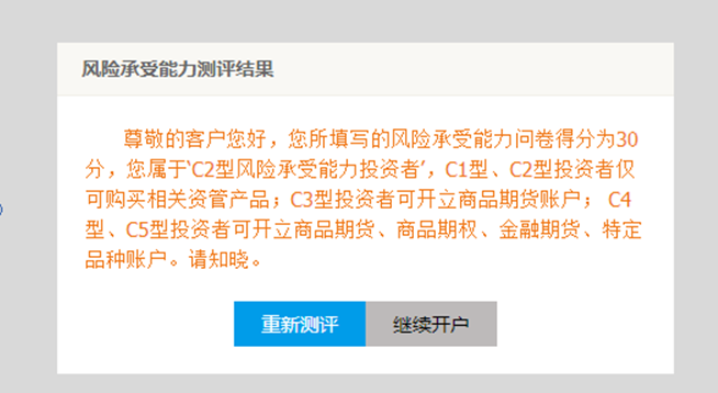 請客戶評估自己風險承受能力測評結果,并根據(jù)自己情況確認 “重新測評”,重新進行答題。還是“繼續(xù)開戶”,進入賬戶選擇頁面。