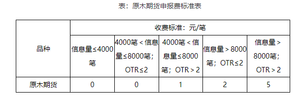 原木期貨合約申報費按合約統(tǒng)計;原木期權合約申報費按合約月份統(tǒng)計。