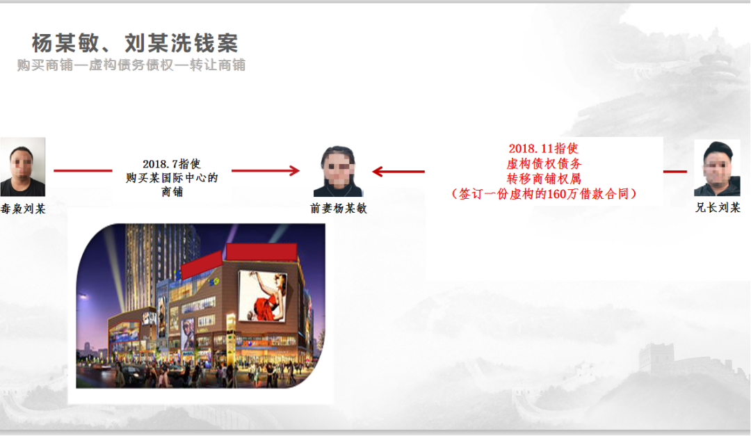 2018年,廣州警方聯(lián)合廣西南寧、欽州,云南保山、德宏等地禁毒部門偵破一宗毒品案件,繳獲海洛因81公斤,該案是近三年來(lái)廣州市單案繳獲海洛因最多的案件,然而毒梟劉某名下個(gè)人財(cái)產(chǎn)幾乎為零,明顯不符合常理。經(jīng)警方調(diào)查后發(fā)現(xiàn),毒梟劉某前妻楊某敏名下?lián)碛幸惶變r(jià)值超459萬(wàn)元的別墅和200余萬(wàn)元的現(xiàn)金存款,其兄長(zhǎng)劉某亦在短時(shí)間內(nèi)先后開(kāi)辦了鎮(zhèn)上最大的超市、火鍋店,還擁有一套價(jià)值200萬(wàn)元的商鋪,有關(guān)異常情況引起了廣州禁毒部門的關(guān)注。經(jīng)分析研判,發(fā)現(xiàn)毒梟劉某的前妻楊某敏和其兄弟劉某有掩飾、隱瞞毒資的重大嫌疑,后抓獲涉嫌洗錢罪的犯罪嫌疑人劉某和楊某敏,查封扣押涉案資金、不動(dòng)產(chǎn)和車輛折合人民幣約800萬(wàn)元。洗錢手法如下: