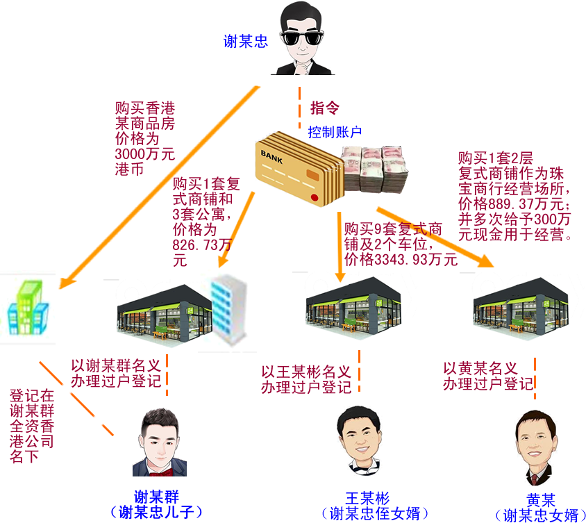 2013年起,以謝某忠為首的黑社會(huì)性質(zhì)組織與走私集團(tuán)勾結(jié),以黑護(hù)私、以私斂財(cái),非法獲利共計(jì)超過(guò)人民幣1億元。為掩飾、隱瞞組織、領(lǐng)導(dǎo)黑社會(huì)性質(zhì)組織犯罪所得及產(chǎn)生的利益,謝某忠兒子謝某群、侄女婿王某彬、女婿黃某在明知謝某忠的資金系黑社會(huì)性質(zhì)的組織犯罪所得的情況下,配合謝某忠實(shí)施了一系列洗錢行為,采取提供賬戶資金、買賣或投資等方式協(xié)助轉(zhuǎn)移、轉(zhuǎn)換財(cái)產(chǎn),洗錢金額累計(jì)達(dá)8847.45萬(wàn)元人民幣、3000萬(wàn)元港幣。2020年4月1日,佛山市中級(jí)人民法院二審裁定謝某群、王某彬、黃某三人的行為均已構(gòu)成洗錢罪,判處有期徒刑五年六個(gè)月、三年三個(gè)月、一年九個(gè)月,并分別處罰金人民幣400萬(wàn)元、200萬(wàn)元、60萬(wàn)元,同時(shí)沒收被告人王某彬所退贓款人民幣4294750元上繳國(guó)庫(kù)。