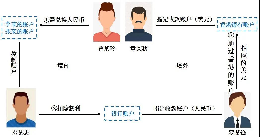 (二)通過控制多個(gè)個(gè)人銀行賬戶協(xié)助兌換外匯轉(zhuǎn)移至境外。袁某志未經(jīng)國家有關(guān)主管部門批準(zhǔn)的情況下,非法經(jīng)營外匯兌換業(yè)務(wù),在上游客戶羅某鋒(另案處理)報(bào)價(jià)的基礎(chǔ)上,加價(jià)與下游客戶進(jìn)行兌換,從中賺取差價(jià)牟利。2018年5月至2020年5月期間,袁某志在明知曾某玲、章某秋從事走私犯罪的情況下,與兩人商談好兌換匯率、兌換金額后,袁某志通過其控制的李某、張某等人的銀行賬戶收取曾某玲、章某秋轉(zhuǎn)入的人民幣,扣除自己的獲利,將剩余人民幣轉(zhuǎn)給上游客戶羅某鋒指定的銀行賬戶,并將曾某玲、章某秋提供的香港收款賬戶發(fā)給羅某鋒。羅某鋒收到款項(xiàng)后,通過香港的銀行賬戶將相應(yīng)的美元轉(zhuǎn)入曾某玲、章某秋提供的香港收款賬戶中。經(jīng)查實(shí),袁某志為曾某玲、章某秋非法兌換外匯并將資金匯往境外,金額共計(jì)人民幣17355.74萬元,非法獲利34.71萬元。