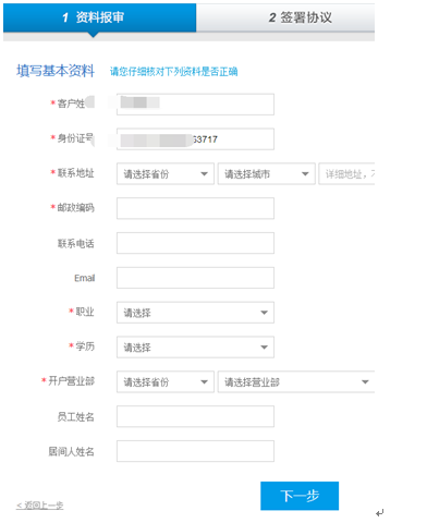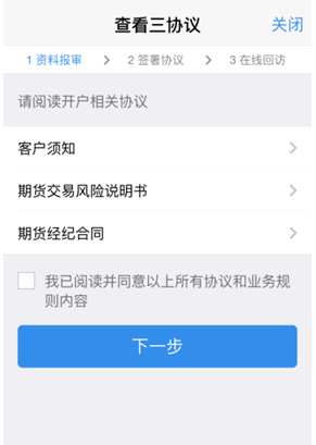 7、進入界面閱讀相關協(xié)議 ,相關協(xié)議為必讀項,閱讀完才可以點擊下一步,否則會提示“請拖動滾動條,閱讀完開戶相關協(xié)議”。