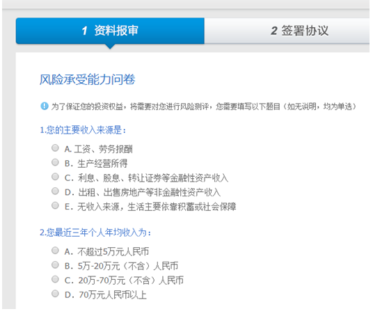 普通投資者點擊“下一步”進入到風險承受能力問卷頁面, 投資者需根據(jù)自身實際情況回答。