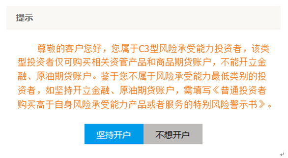 8、完成適當性試題。其中,C1類投資者中風險承受能力最低的客戶無法開戶,C1、C2類投資者且不屬于風險承受能力最低的客戶可在視頻后簽署相關協(xié)議開通賬戶,C3類投資者僅能開通商品期貨,C4和C5類投資者可開通原油和金融期貨
