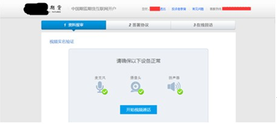 8、視頻界面系統(tǒng)會自動識別本機硬件的正常性,如果是正常就顯示綠色的對勾;否則會顯示紅色的叉號,客戶可以安裝相應的驅動或者換一臺具備所需硬件的電腦即可。視頻認證需請客戶手持本人身份證與期貨公司的開戶崗進行視頻驗證,點擊“開始視頻通話”,排隊頁面顯示的客戶數(shù)量是所有系統(tǒng)中同時發(fā)起視頻的客戶數(shù)量。視頻排隊界 面: