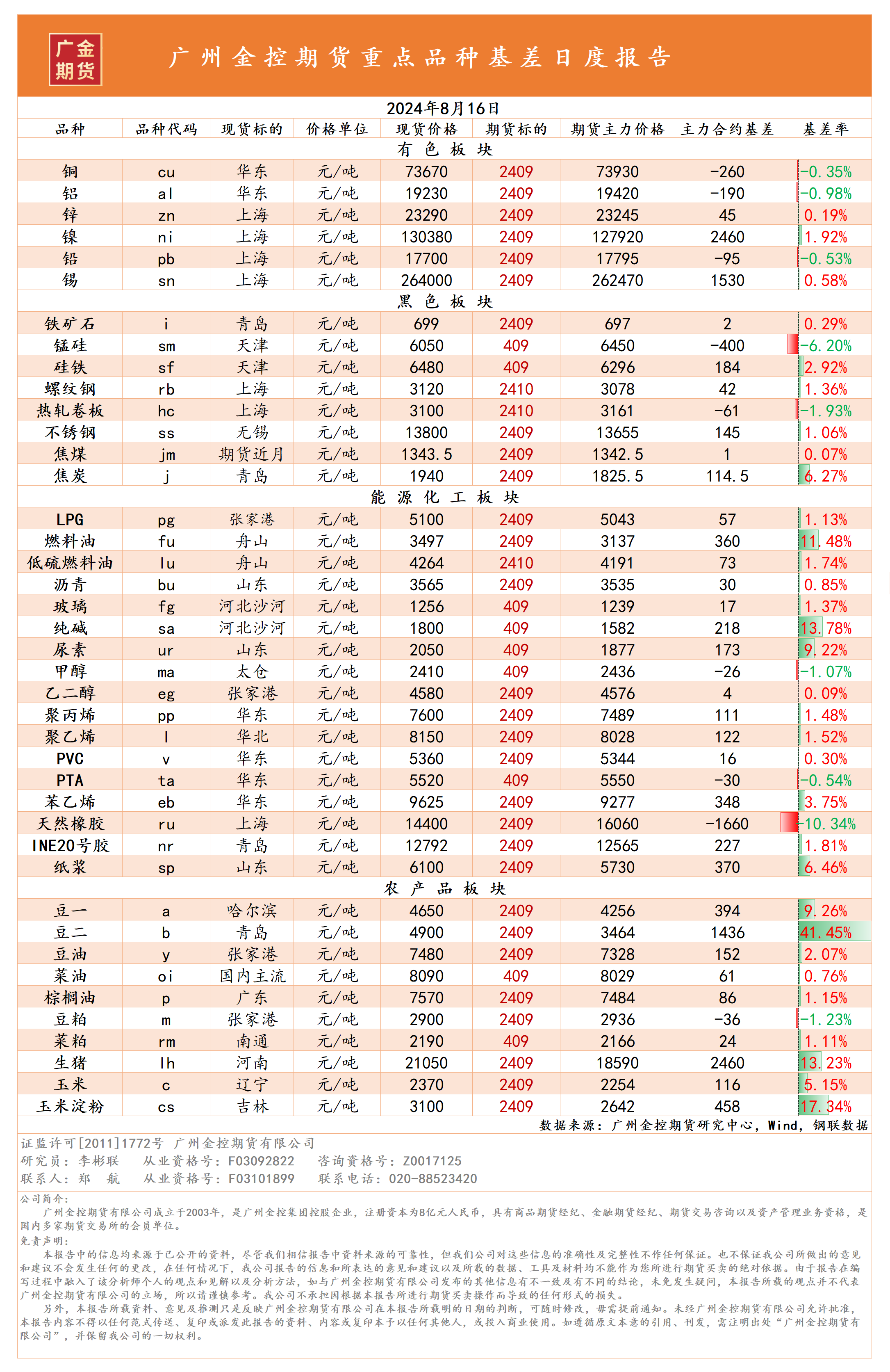 重點(diǎn)品種資金流向與基差日報(bào) 20240816