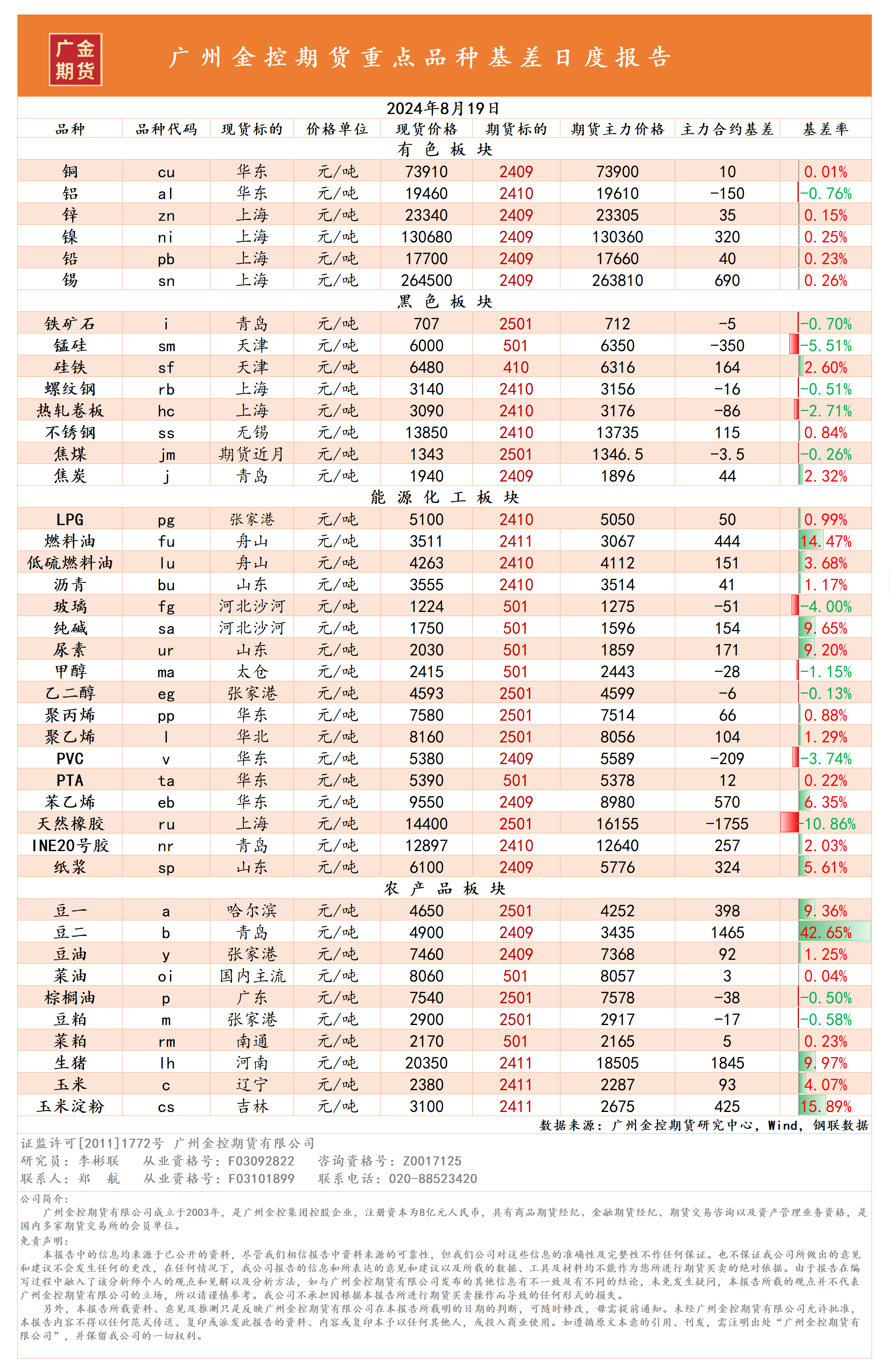 重點品種資金流向與基差日報 20240819