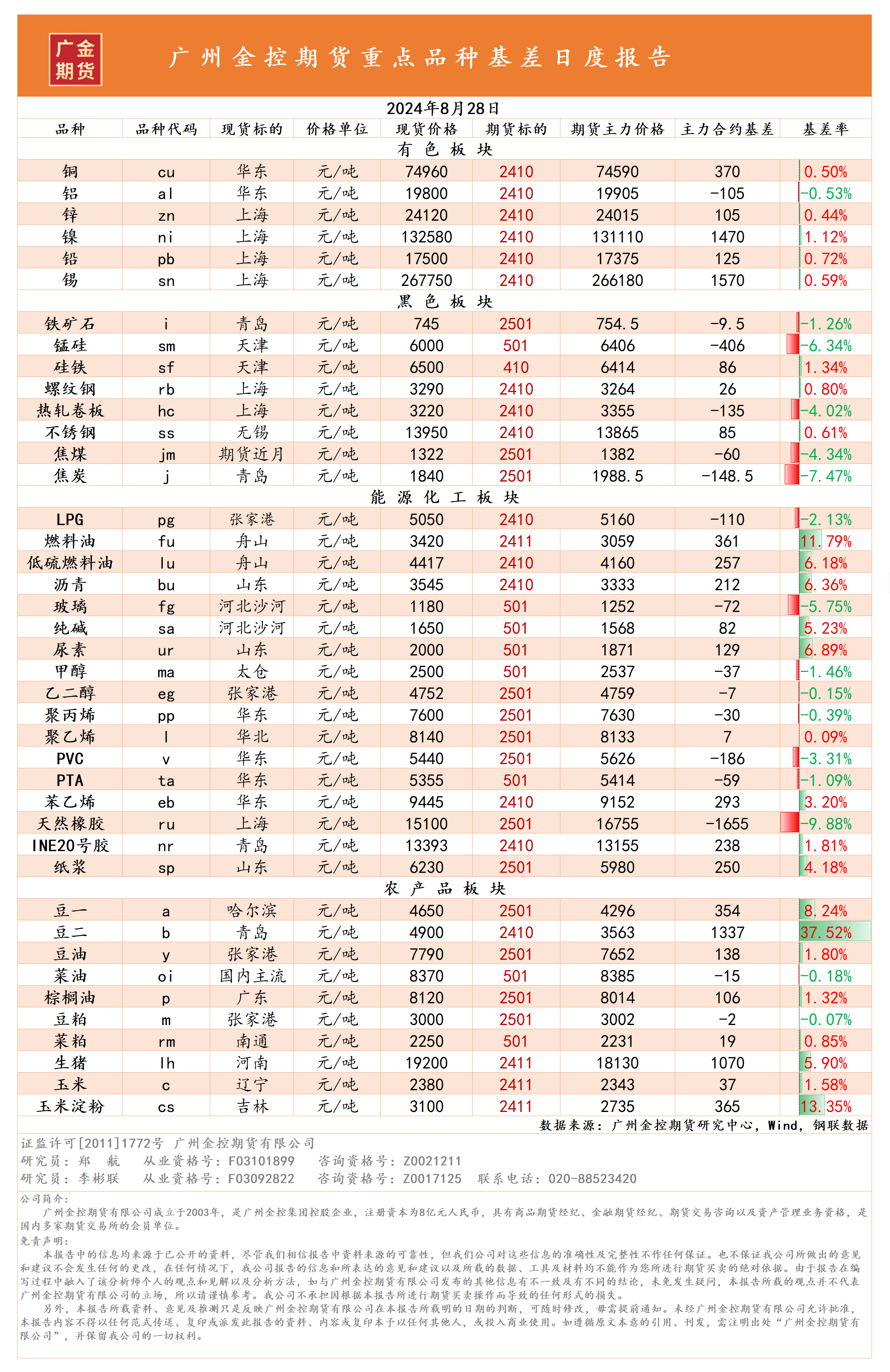 重點(diǎn)品種資金流向與基差日?qǐng)?bào) 20240828