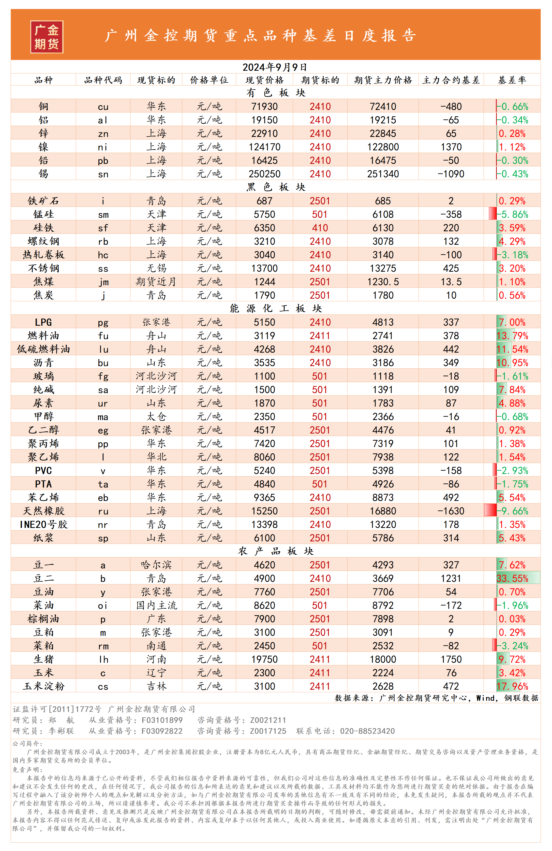 重點(diǎn)品種資金流向與基差日報(bào) 20240909