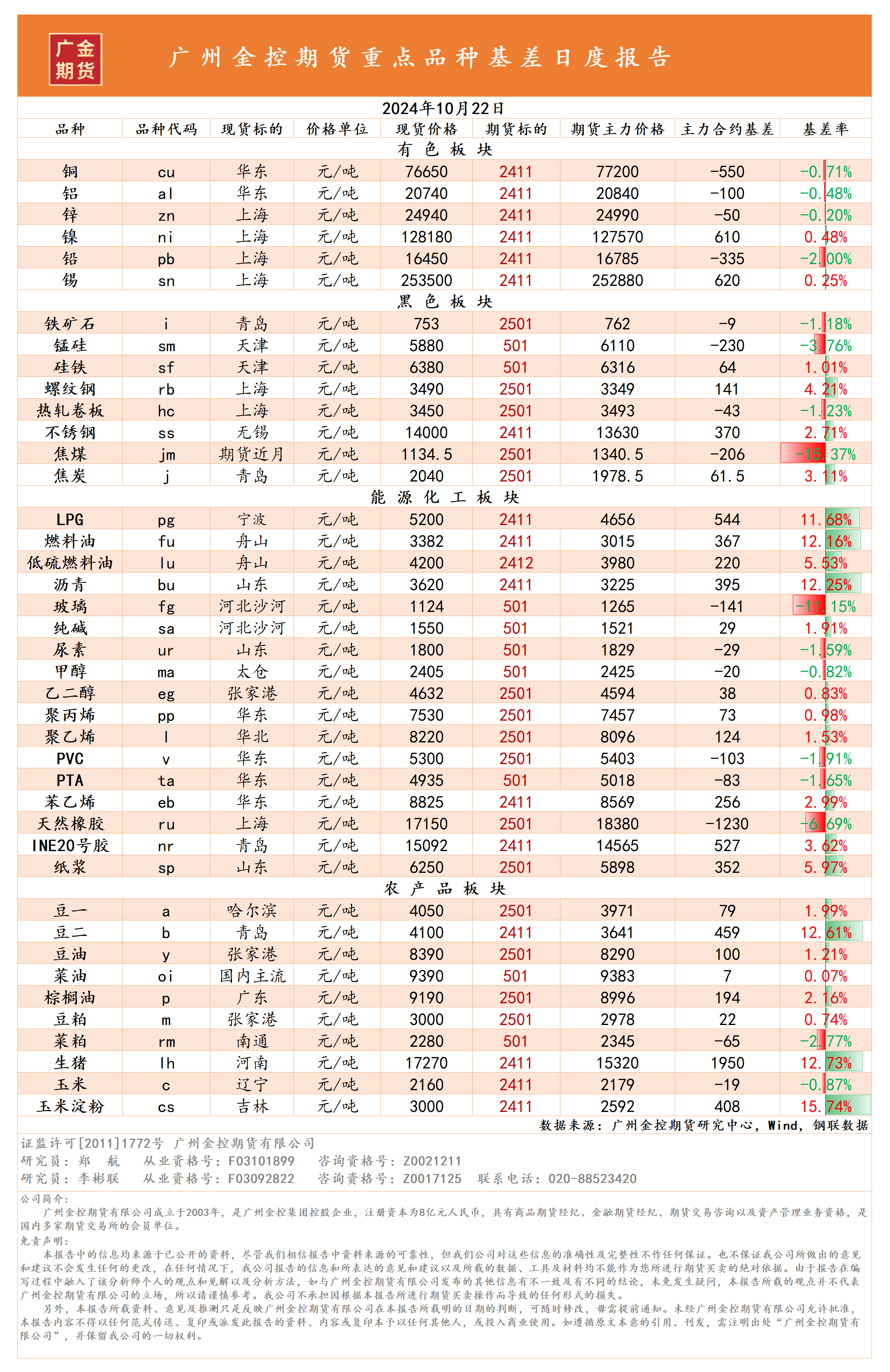 重點(diǎn)品種資金流向與基差日?qǐng)?bào) 20241022