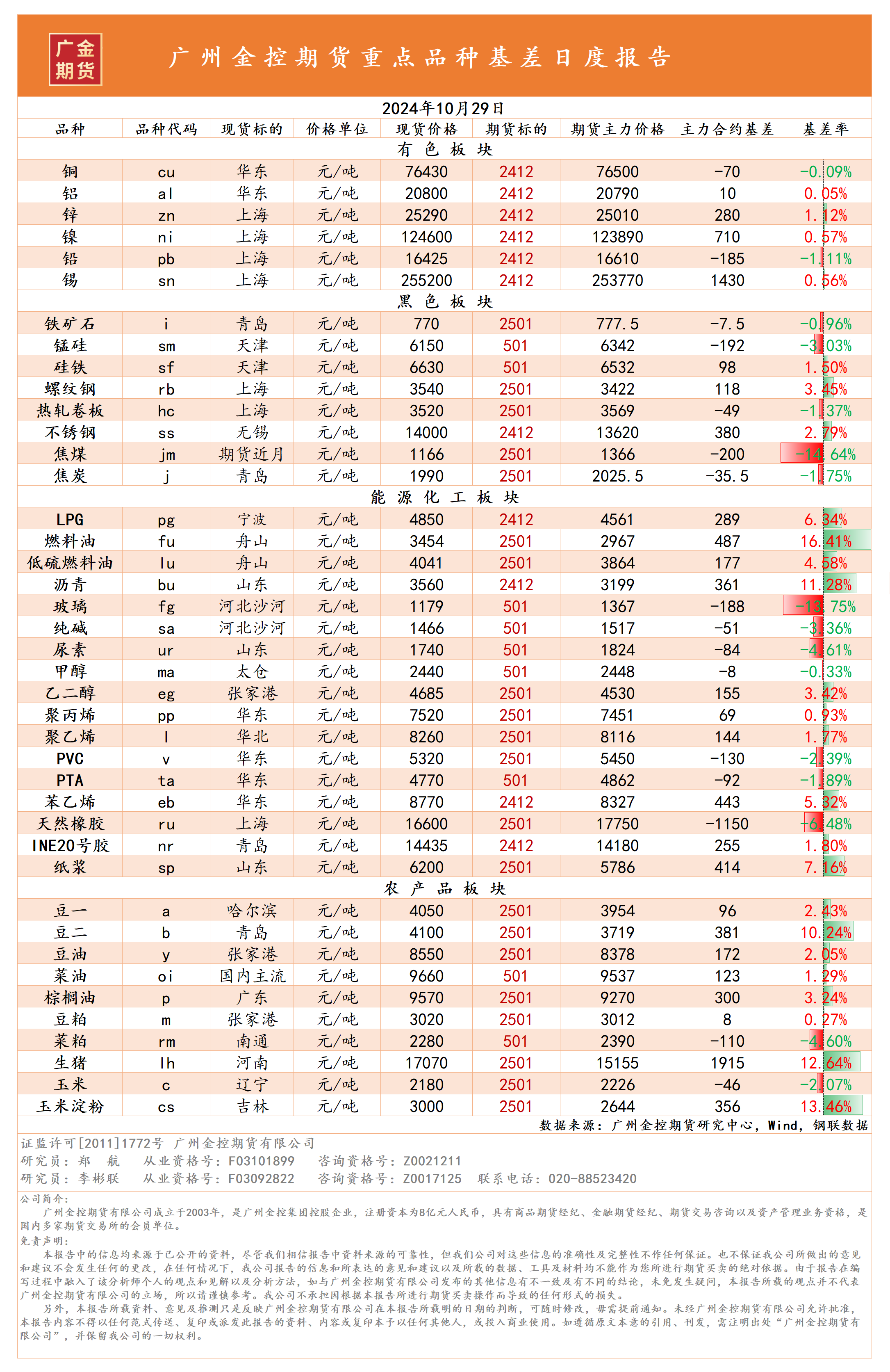 重點(diǎn)品種資金流向與基差日?qǐng)?bào) 20241029