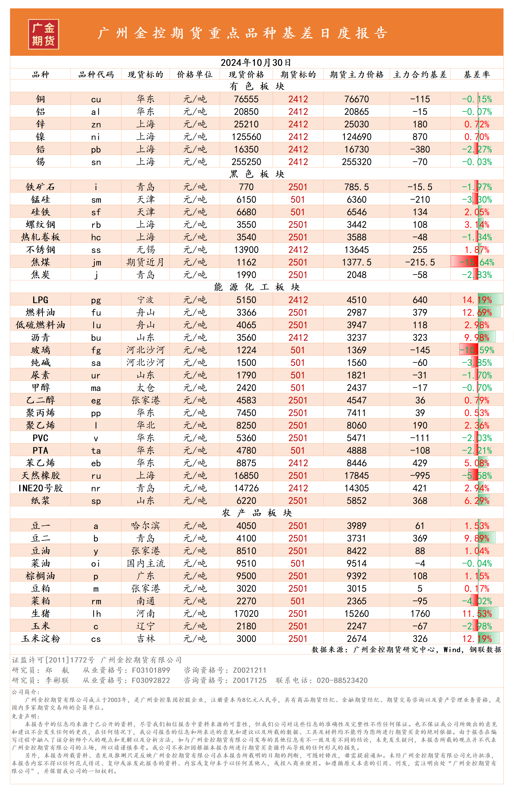 重點品種資金流向與基差日報 20241030