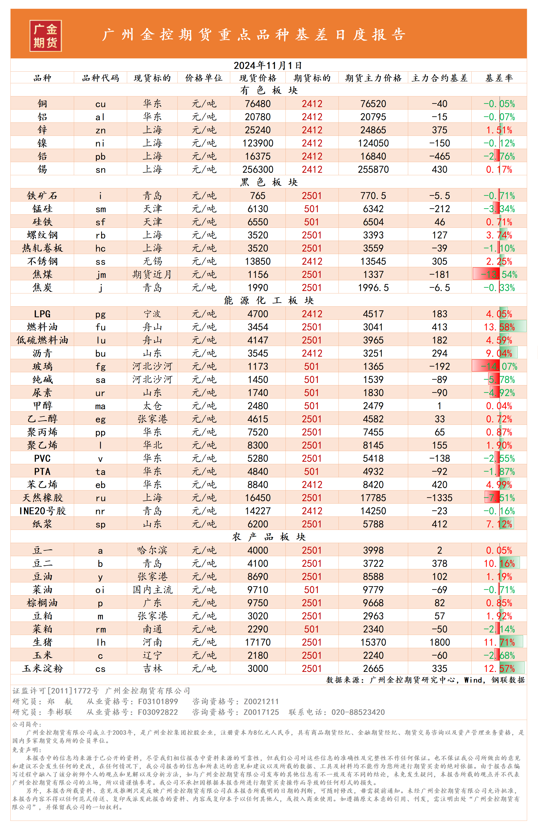 重點(diǎn)品種資金流向與基差日?qǐng)?bào) 20241101