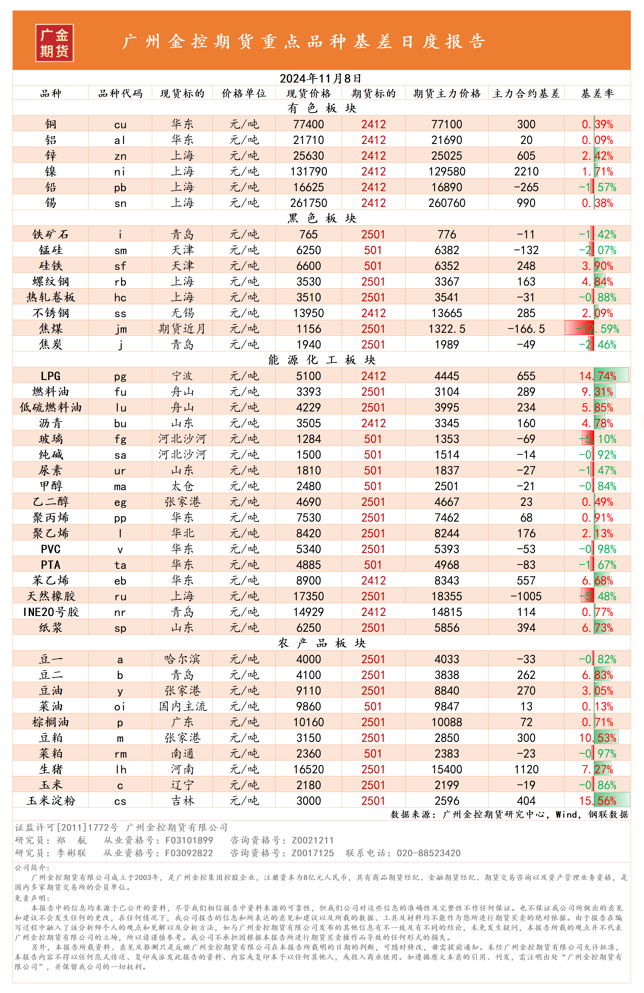 重點(diǎn)品種資金流向與基差日報 20241108