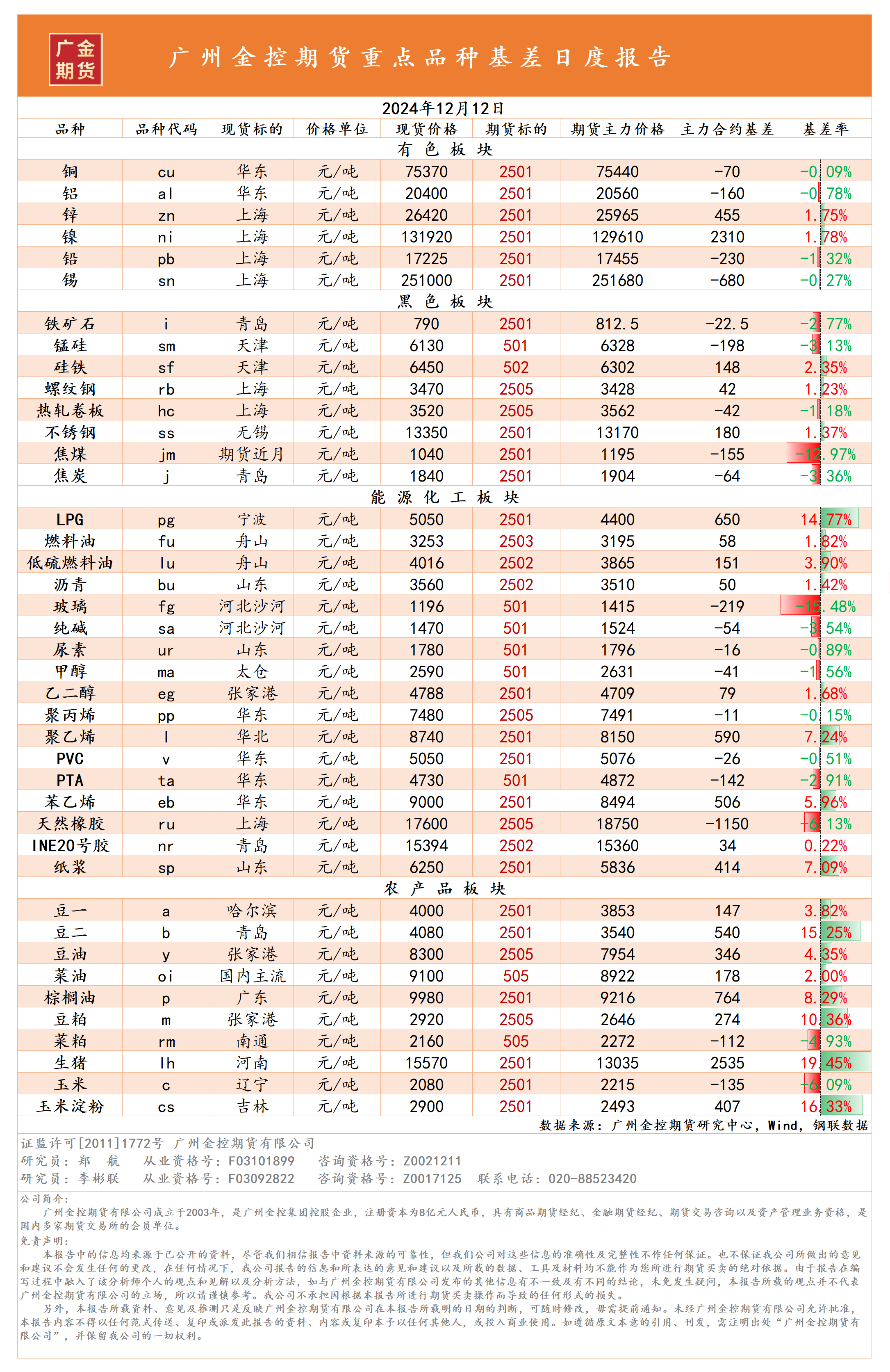 重點(diǎn)品種資金流向與基差日?qǐng)?bào) 20241212