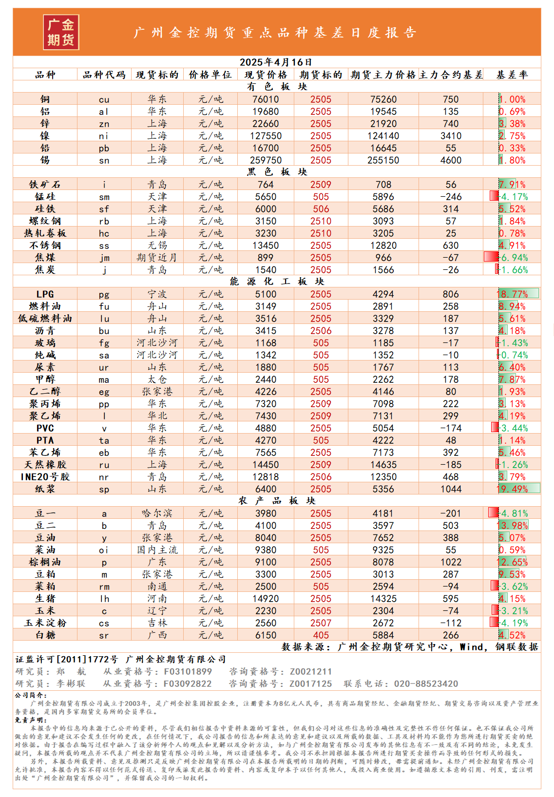 重點(diǎn)品種資金流向與基差日?qǐng)?bào) 20250416