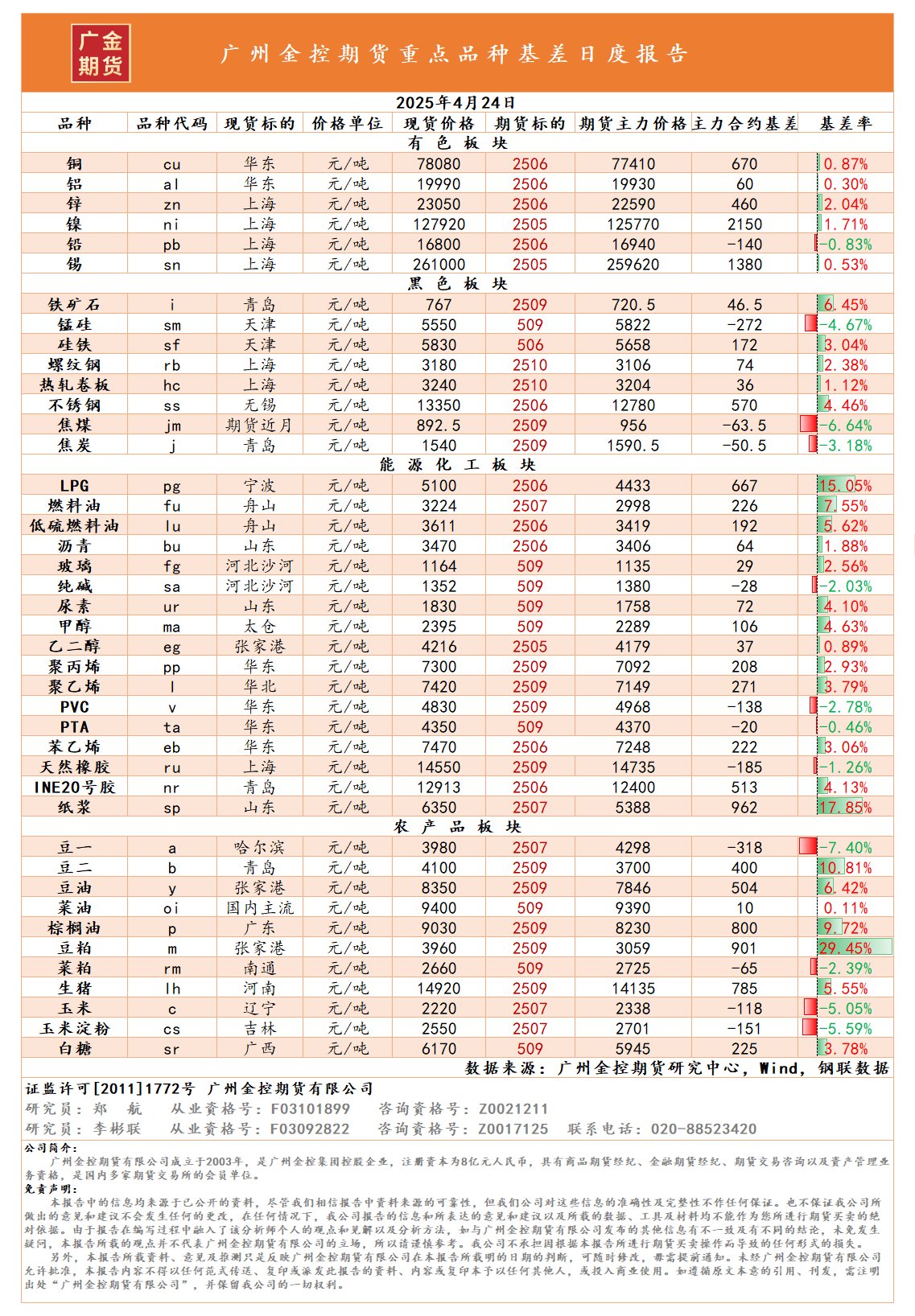重點(diǎn)品種資金流向與基差日?qǐng)?bào) 20250424