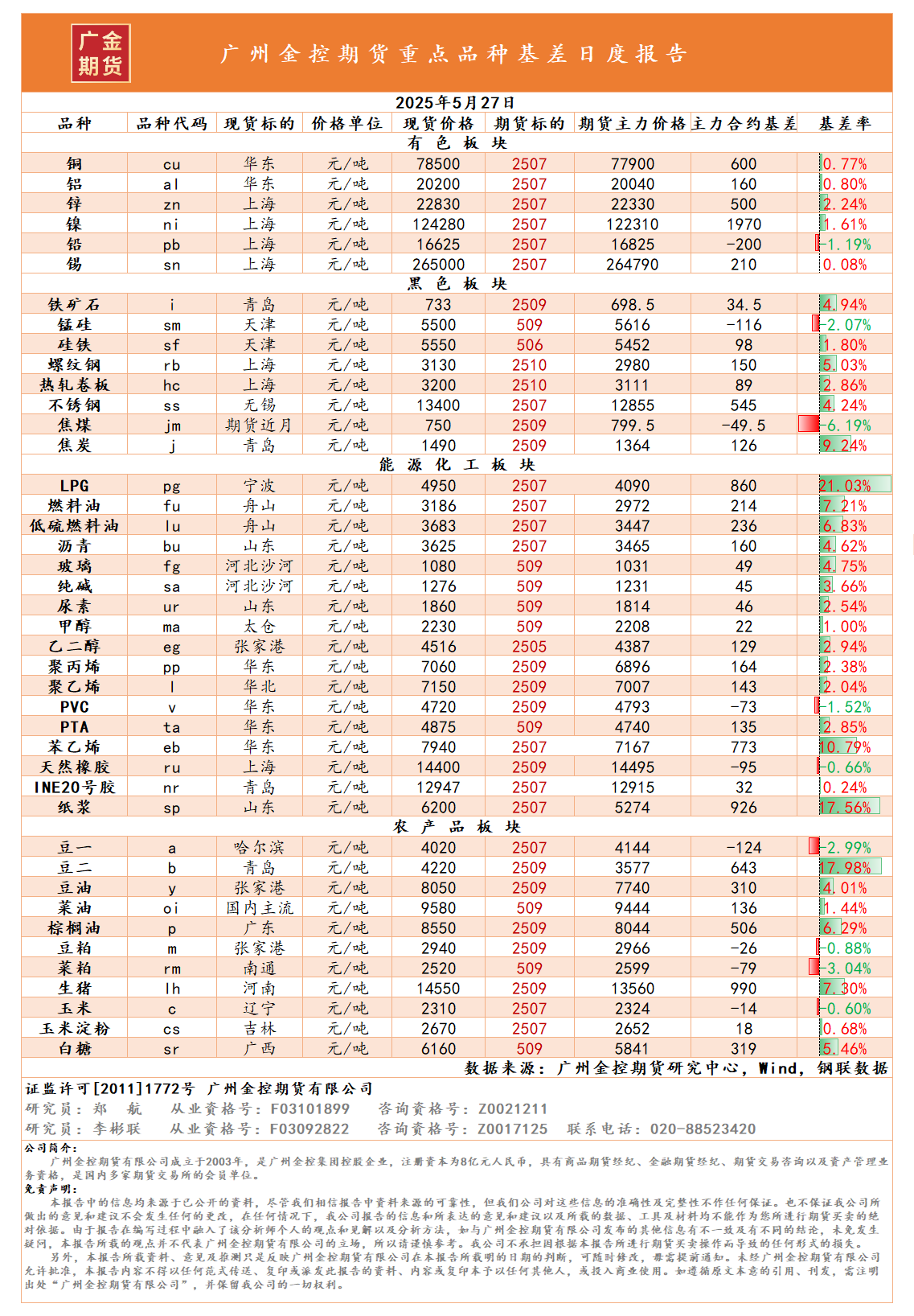 重點(diǎn)品種資金流向與基差日?qǐng)?bào) 20250527
