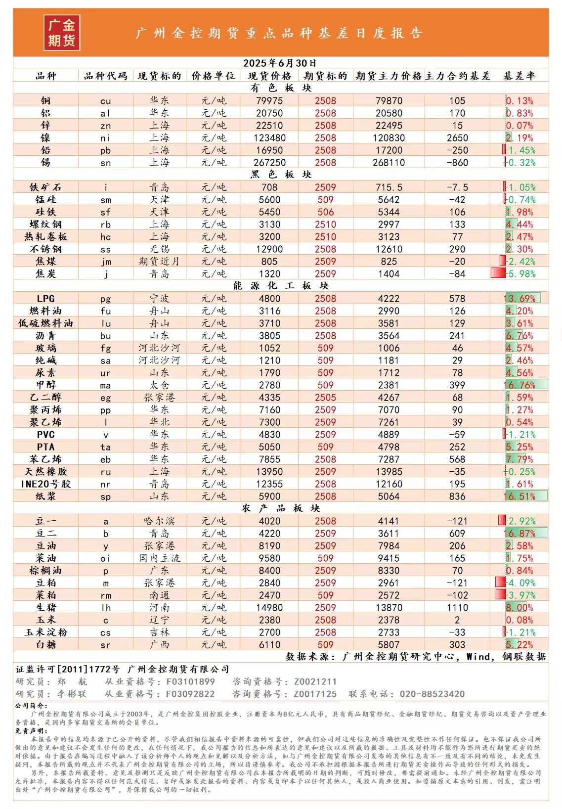 重點(diǎn)品種資金流向與基差日報(bào) 20250630