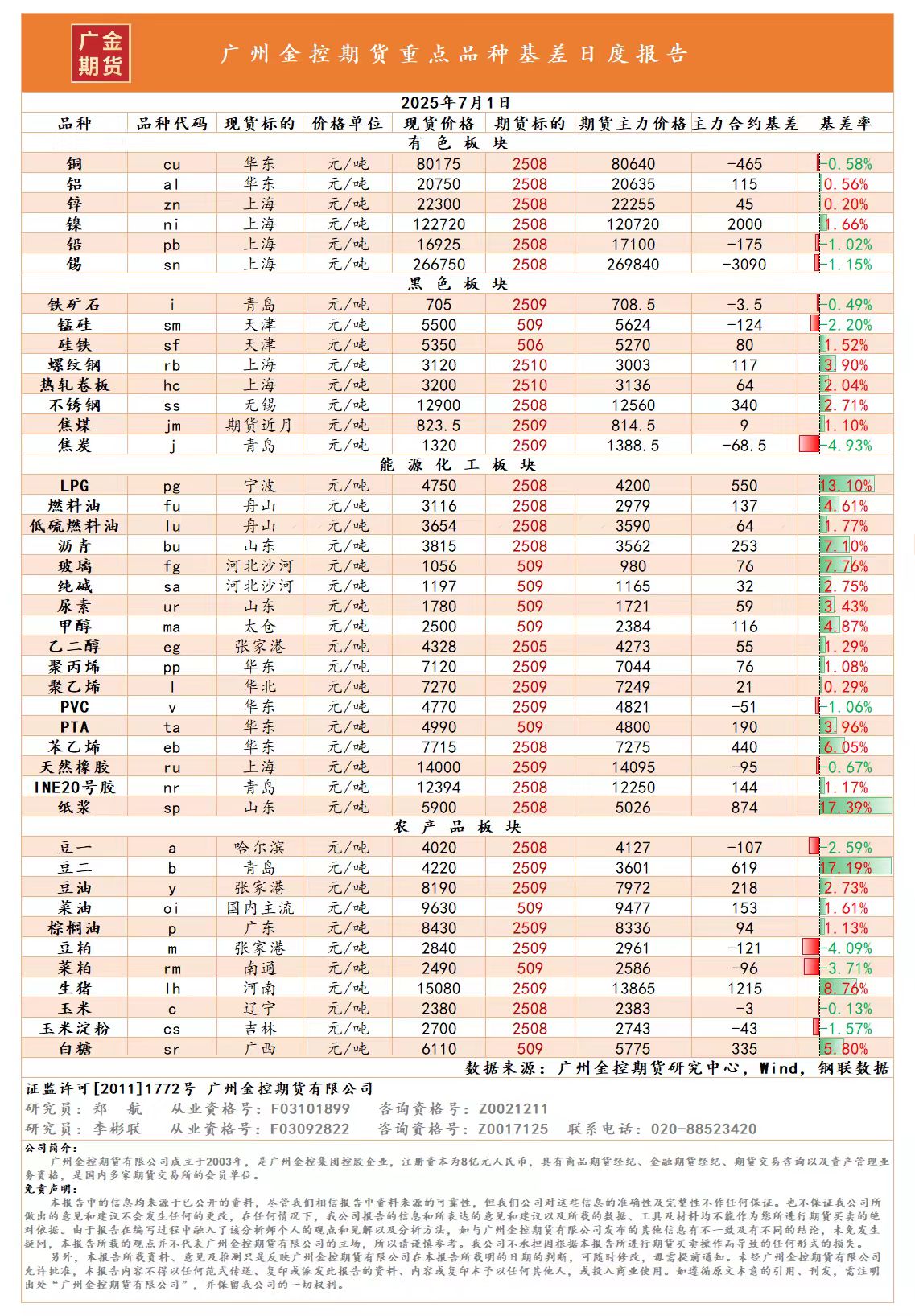 重點(diǎn)品種資金流向與基差日報(bào) 20250701