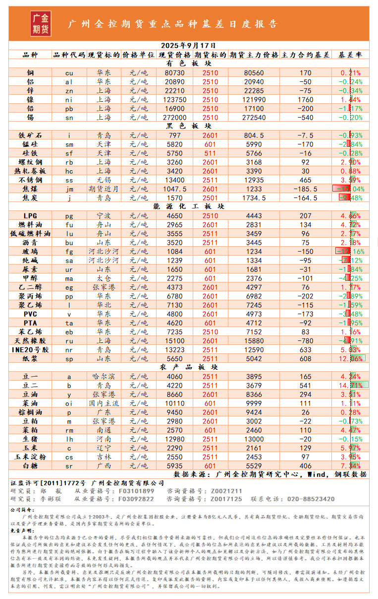 重點(diǎn)品種資金流向與基差日?qǐng)?bào) 20250917