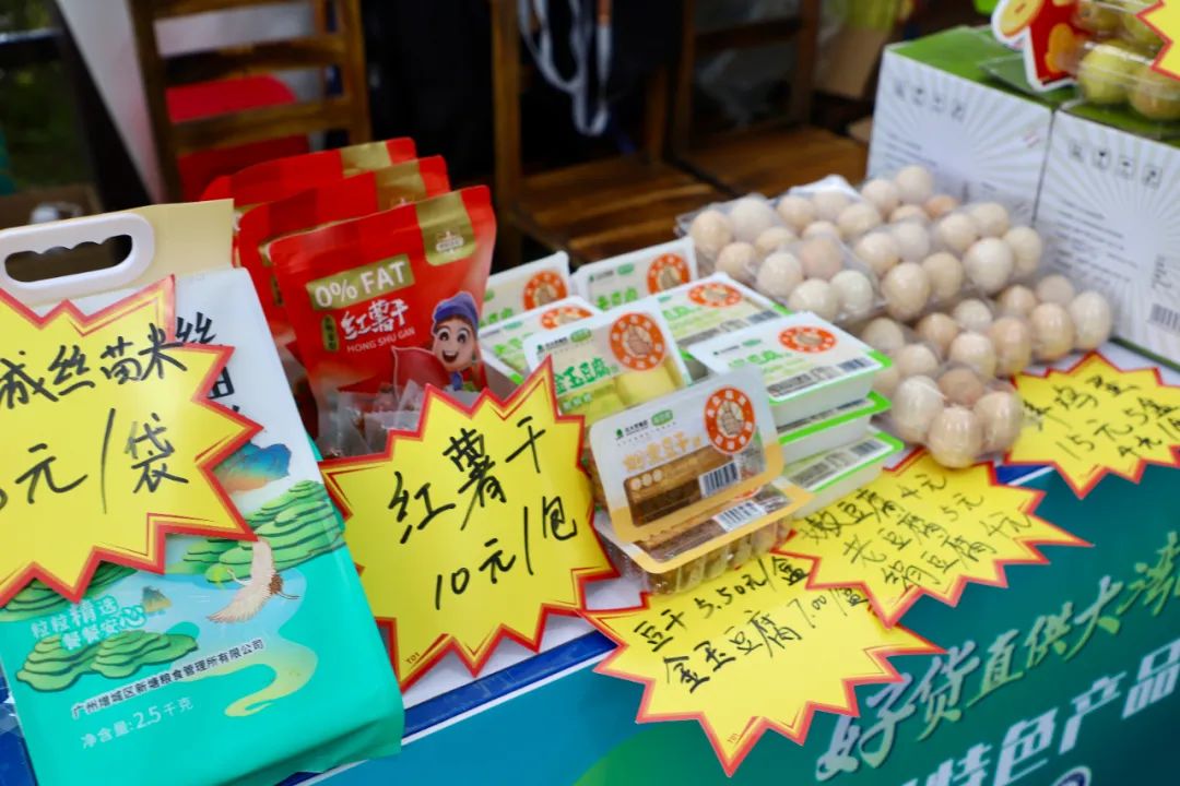 此次助農(nóng)集市開設(shè)了對口幫扶地區(qū)產(chǎn)品展銷專區(qū),集中展示廣州市幫扶合作7省、11地市、63縣(區(qū))和花都區(qū)等地優(yōu)質(zhì)農(nóng)副產(chǎn)品,吸引了眾多農(nóng)業(yè)企業(yè)、合作社、家庭農(nóng)場參與。廣東省連州市等地名優(yōu)特產(chǎn)及本土小吃在雨天仍持續(xù)熱銷,千斤高山紅薯“一掃而空”,深受市民喜愛。南方鄉(xiāng)投旗下南方菜籃子平臺廣東增城絲苗米、北大荒旗下益豆君豆腐等鄉(xiāng)村振興產(chǎn)品陳列上架銷售。