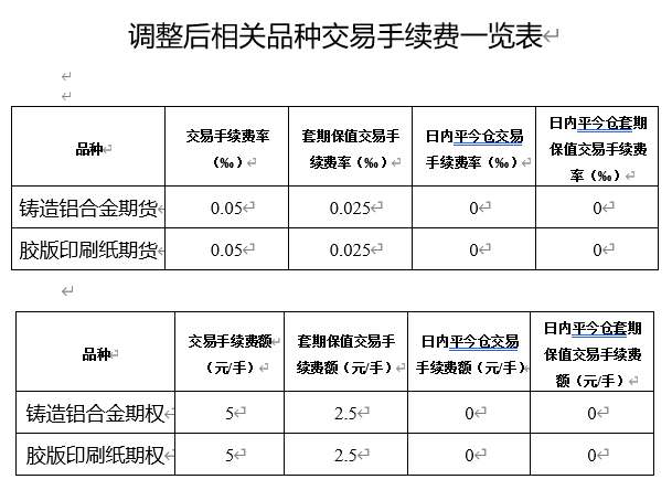 鑄造鋁合金期貨和膠版印刷紙期貨的交易手續(xù)費(fèi)調(diào)整為成交金額的萬分之零點(diǎn)五,免收日內(nèi)平今倉交易手續(xù)費(fèi)。